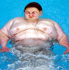 黄佳鑫减肥的大部分有氧运动是在一家大饭店的健身中心完成的,1个小时的上下楼梯、“太空”踏步和拉力等运动后,就是游泳。游泳是他最感兴趣的项目,他顺着梯子缓缓地挪到游泳池,一触到水,就“活”了起来,一会儿蛙泳;一会儿仰泳;一会儿自由泳……甚至还可以自在地浮在水面上。