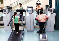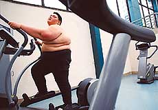 ▲在健身中心,黄佳鑫在“太空”踏步机上运动减肥。 |