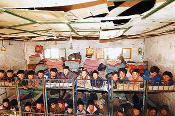 记者近日在青海省循化县采访时发现,当地一些寄宿制学校存在宿舍严重超员现象。在循化县文都乡希望小学,一些不到8平方米的学生宿舍内挤住着30多人,由于床铺少,孩子们只能两三个人挤睡在一张床上。这些学生宿舍多为年久失修的土木结构教室改建,床铺间距小,存在严重安全隐患,校舍环境亟待改善。文都乡希望小学的学生们在自己的床位上准备午休。