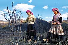 | ▲4月9日,61岁的苗族老人张秀英和女儿站在一片焦土上,寻找自家丢失的羊。 |