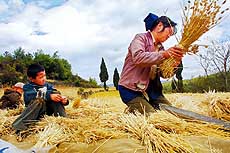 ▲4月9日,小妥吉村的熊金娣正在抢收小麦。她的丈夫还在火场。农忙季节,不少因大火转移到山下的村民都纷纷提前回家,抢收庄稼。 |