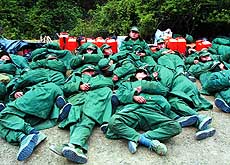 | ▲坚守火场的武警云南总队战士们躺在地上休息。 |
