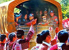 卡车不断地从更高的山上驶来,车里坐满了身着红色制服的森警,战士们挥手告别。