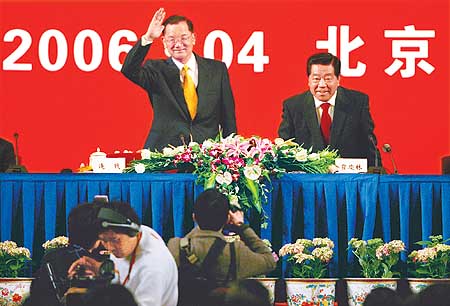 照片:4月14日,两岸经贸论坛在北京开幕。中共中央政治局常委、全国政协主席贾庆林(右)与中国国民党荣誉主席连战出席开幕式并分别发表演讲。 本报记者 赵青摄
