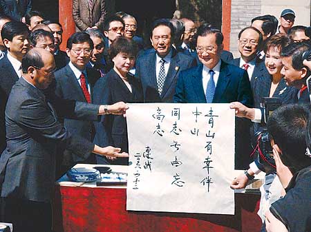 4月15日,中国国民党荣誉主席连战一行抵达北京香山碧云寺,参观孙中山纪念堂并拜谒孙中山先生衣冠冢。这是连战在香山碧云寺孙中山纪念堂题词:“青山有幸伴中山 同志无由忘高志”。