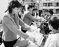 在福贡县,为了感谢当地人民的热情款待,采风团把从人民文学出版社、中国少年儿童出版社和长征出版社募集来的近千本图书捐助给了该县的匹河乡中心小学。其捐助仪式的规格可能是当地最高的,只见十几架照相机对准了主席台上的嘉宾和操场上的几百名小学生,快门频闪;中央人民广播电台的陈雅平和中国国际广播电台的刘伟,手拿采访机,不失时机地伸到被采访对象的身前……在这些记者的镜头面前,小学生们一点儿也不拘谨,个个眉开眼笑,稚气可爱。