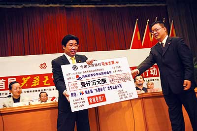 以“传递价值,成就你我”为主题的第九届“芙蓉学子”大型公益活动日前启动。活动由共青团湖南省委、常德卷烟厂联合主办。常德卷烟厂向湖南省青基会捐赠“芙蓉学子”公益活动款1000万元,用以资助家庭经济困难大学本科新生、奖励优秀大学生、开展芙蓉王注册志愿者关爱农村留守儿童行动和环洞庭湖湿地科考实践等活动。近9年来,常德卷烟厂累计捐资2987万余元,奖励、资助了6376名优秀大学生及寒门学子。图为团湖南省委书记吴奇修(左)从常德卷烟厂“芙蓉王”实业总经理王吉斌手中接过捐赠支票。 刘谦摄