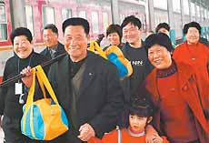 4月30日,自费赴京七日游的山东省临沂市苍山县神山镇东南村的农民方贵钦(左二)夫妇和乡亲们正走进临沂火车站站台。