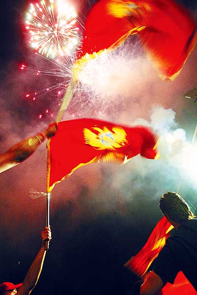 黑山共和国全民公投委员会主席弗朗齐歇克·利普卡22日宣布正式计票结果:55.4%黑山公民支持独立,超过欧盟规定的55%“独立线”。0.4%的微弱优势,宣告黑山共和国脱离塞尔维亚怀抱,原南联盟完全瓦解。图为人们在黑山共和国首府波德戈里察的街头挥舞旗帜,庆祝在全民公决中获胜。