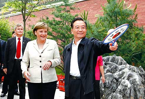 5月22日,国务院总理温家宝陪同正在北京进行正式访问的德国总理默克尔在北京菖蒲河公园散步。这是温家宝在向默克尔介绍太极柔力球的玩法。