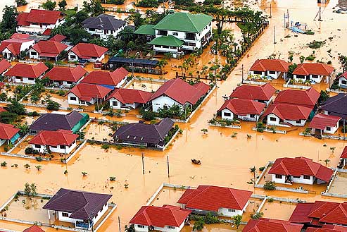 5月23日,泰国曼谷以北的程逸府在一片汪洋之中。连续几天的暴雨以及引起的泥石流近日造成泰国北部五府至少30人丧生,数百人失踪,大批居民被洪水围困。洪水还造成交通、电力和通讯系统一度中断,给救援行动带来了困难。泰国气象部门预测,在未来两三天内,暴风雨将继续侵袭数个北部地区的府,并可能引发更大规模的洪灾。