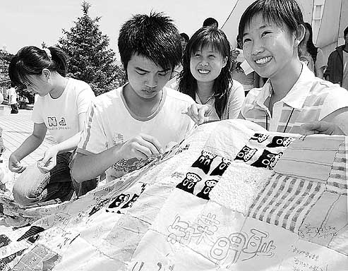 5月24日,沈阳师范大学几名学生正在用碎布片缝制“百衲被”。当日,沈阳师范大学几十名学生聚在一起,自己动手将1300块碎布缝成“百衲被”。碎布上写有学生们自己的祝福或是励志名言。活动旨在引导学生树立荣辱观,做一个有理想、有道德、知荣明耻的人。