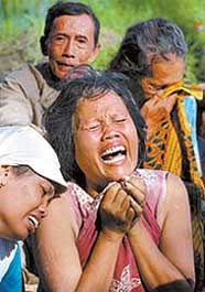 照片左:失去亲人的地震灾民悲伤不已。新华社/法新