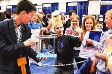 | ▲中国吉林省实验中学的李珅正在用一个模型形象地向美国小朋友介绍他进一步验证的“热水快于冷水结冰”的理论。 |