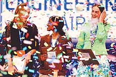 ▲颁奖典礼上,获得大赛最高奖——“英特尔基金青年科学家奖”的三位女生汉纳·沃尔夫(左)、迈德哈维·加文(中)和麦克格雷格。 |