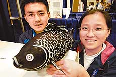 | ▲华中师大一附中的刘鬯和芦幸研制的“仿生机器鱼”,模仿鱼类的尾部摆动,创造一种新的推进方式来代替传统的螺旋桨。 |