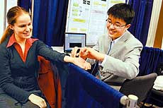 ▲华东师大二附中的赵亮在给隔壁展位的瑞士姑娘科尔曼号脉。赵亮的研究课题——《计算机虚拟仪器辅助中医脉诊系统初探》,将中医脉诊与现代工程学、信息学技术相结合。 |