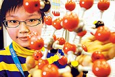 满脸青春痘的朱若辰很不安分,拿着小数码相机在赛场上东拍西照。他自称小时候很淘气,曾把青蛙绑在自制的火箭上射向天空。他的项目针对东亚地区桑花叶萎缩的普遍现象,开展了类病毒研究,摘得了微生物学类的二等奖。