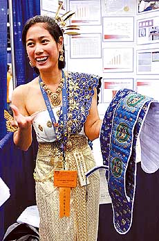 ▲泰国的皮亚珀·尤苏在讲解她设计和制作的具有浓郁民族特色的缓痛腰带。 |