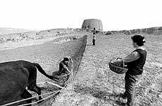 宁夏盐池县长城脚下,午后的烈日把黄土和石砾照得亮花花的,直晃人眼。昔日的军事重地兴武营,仅残存着瓮城。一面城墙外,黄土地已经变成了流沙,几根枯藤老枝孤零零地插在上面。不远处,妇女正忙着在这样的土地上准备播种,她们三三两两地在自己的影子上翻地、喷洒除草剂。女人们大多都穿着红上衣,围着极艳的红头巾。