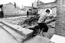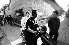| 雎有明的家其实只有三面墙。后墙正是穿过山西阳高县乳头村的夯土长城,午饭后撤下的一脸盆馒头就摆在城墙下的柜子上。雎有明和邻居准备着下午上地里的农具,她72岁的老妈则边收拾碗筷,边准备上房顶。那时阴云密布,老太太上到紧挨着城墙的屋顶上,把塑料布重新铺整齐,以免下雨时屋里漏水。家里平时并没有其他劳力。雎有明买来的四川女人生了两个男孩,跟他过了7年后,终于带着孩子跑回老家了。他去四川找,人家死活不回来。