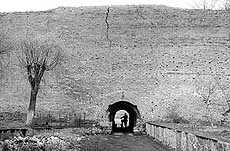 | ▲山海关。行人从一处老城墙下穿行。 |