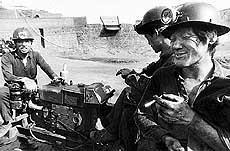▲5月18日,在陕西府谷龙王庙,长城只剩下了一座残破的敌楼。山下的煤矿,几位矿工收工回家。吸着纸烟的老张哥俩(右)是从陕西关中的礼泉来到陕北打工的,每月可以挣到2000多元,但年底才能拿到工钱。 |