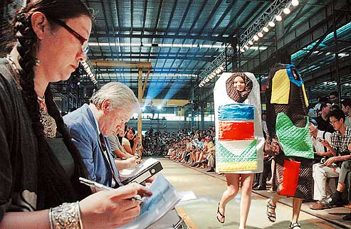 7月7日,北京某车间的车床轨道变成了天然的T型台,北京ESMOD高级时装艺术学校的学生们身穿自己设计的服装,在该校迎奥运服装设计选拔赛上进行展示。
