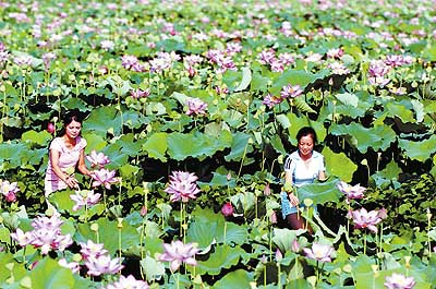 7月28日,两位游客在广昌县驿前镇太空白莲基地采摘莲蓬。