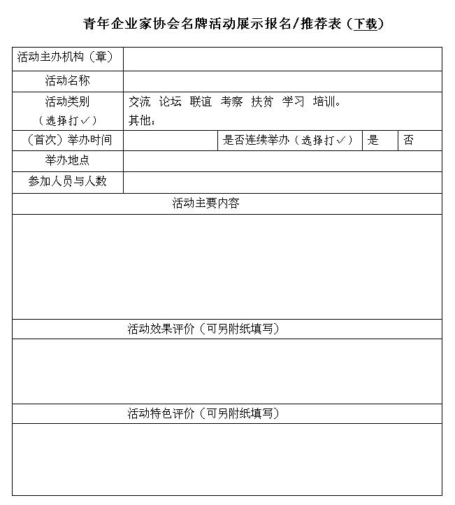 ★本次青年企业家协会名牌活动展示是中国青年企业家协会秘书处和《中国青年报》服务各级青年企业家协会的现实举措,是公益性的,不收取任何报名费、评审费或宣传费。