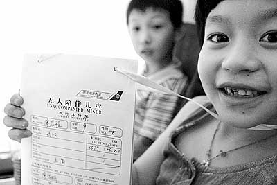 8月1日,在由武汉飞往上海的航班上,一名“邮寄儿童”展示自己的无人陪伴儿童资料。时值暑期,武汉市的一些家长没时间陪送孩子出行度假或探亲,因而选择航空公司的“邮寄儿童”业务,航空公司接送无伴儿童的数量猛增。