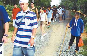 8月9日,进行民俗考察活动的台湾学子与一位阿婆擦肩而过。