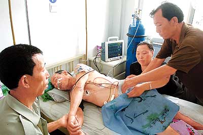 8月13日,山西省运城市临猗县人民医院,几位亲属在照顾一位乙脑感染者。