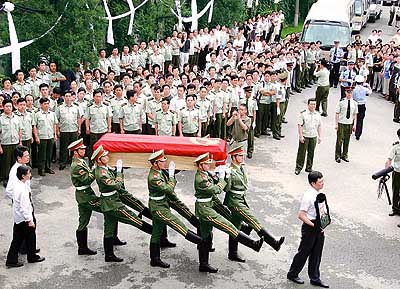 8月14日,仪仗兵抬着华益慰的灵柩缓缓走向灵车。当日,医务人员及社会各界群众3000多人来到北京军区总医院为华益慰送行。