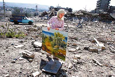 8月15日,在黎巴嫩南部城市奈拜提耶,一名女子从废墟中拾回一幅画。