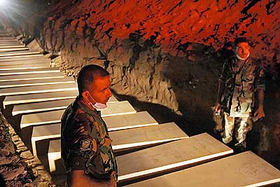 8月15日,34名在以军袭击中丧生的人的棺木在黎巴嫩南部城市提尔等待下葬。