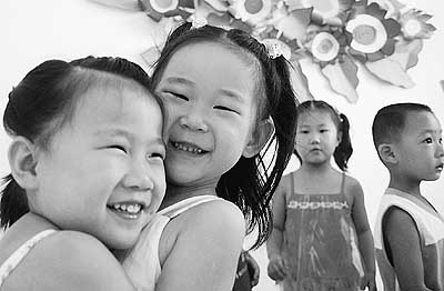 8月16日,在山东师范大学幼儿园,找到伙伴的孩子开心地抱在一起。为解决一些家长暑期没有时间照看孩子的问题,同时让新生提前适应环境,济南市部分幼儿园提前开学。