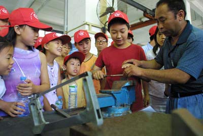8月16日,沈阳金杯教育中心,来自小西路一小的朱济斌小朋友在老师傅的指导下学起钳工手艺。当天,第二届“振兴杯”全国青年职业技能大赛决赛钳工工种比赛在这里开赛。为了让市民更多地了解本次大赛,组委会专门在比赛现场旁设置了“市民观赛区”,预计在未来三天的比赛中,当地团委将组织近万市民前来观摩比赛并亲身实践。