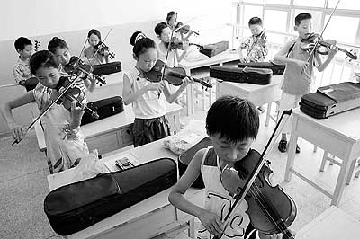 8月17日,南京艺术学院和江苏省音乐家协会南通海安考级考点,参加小提琴考级的小朋友们在进行考前热身训练。当天,海安县300多名青少年参加了小提琴、钢琴、琵琶、二胡、电子琴等乐器的业余级别考试。