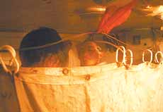 收工后,民工们排队在简陋的洗漱间洗澡。