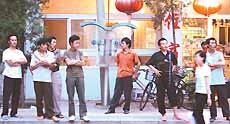 饭后,张建元(左三)和李九龙(左二)像平时一样,在旅馆附近散步。每天他们除了工作,没有什么交际。