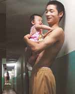 难得工休,年轻的父亲急忙把女儿接到小旅馆来团聚。