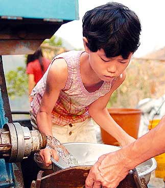 8月26日,重庆市綦江县赶水镇藻渡,当地的孩子排队在运水车旁取水。