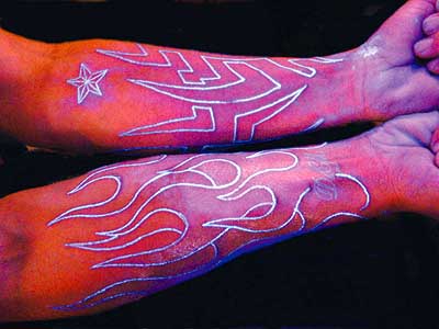 美国加利福尼亚州,一名男子在展示其紫外线文身。这种文身在做完后12~18个月内在普通光线下就完全看不到了,但是在俱乐部酒吧等地的紫外光下就可显现出来。(肖玉溪)