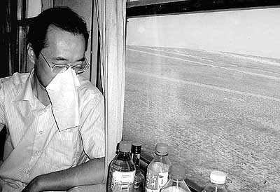 8月29日,由二连浩特登车的李先生在沙尘弥漫的4604次列车上用纸巾捂住口鼻,车窗外是一片荒漠化草场。