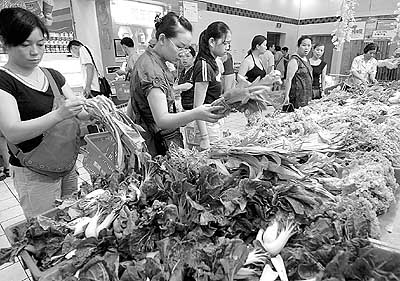 8月31日,市民在重庆新世纪超市内选购蔬菜。据重庆市商委介绍,8月16日该市13家大型企业成立叶类蔬菜“零利润销售”联盟,保证重庆市民在百年一遇的旱灾时吃上平价蔬菜。108家超市叶类蔬菜“零点利”销售措施将持续到旱情彻底缓解后。