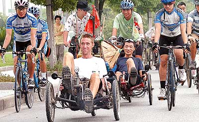 9月1日,英国青年罗布(前)在自行车手的簇拥下骑“三轮躺车”抵达上海。据了解,罗布计划在一年半内,骑“三轮躺车”游中国,并为慈善事业筹款。