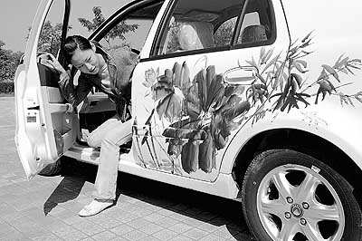 9月10日,在河北省邯郸市南环路中段的街心花园里,一家国产汽车销售商别出心裁地将梅花、荷花、菊花和牡丹的国画图案用广告颜料绘制在汽车车身上(图案可以擦掉),以吸引购车者的视线。