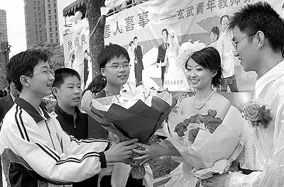 9月10日是教师节,南京市的8位青年教师和自己的爱人在该市大行宫广场举行隆重的集体婚礼,以特殊的方式庆祝自己的节日。图为一对新人在接受学生的祝福。