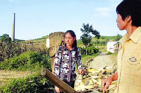 ▲9月8日,在姐姐的帮助下,朱迎春(左)把新收下的一车玉米拉回新寺村。她家的一亩半地紧挨着铅冶炼厂的院墙。除了玉米外,她还种着尖辣椒和青菜。尽管知道受到严重的污染,朱迎春还是要摘一些做菜吃,只是洗菜的时候会多费些水。12岁的儿子在西安被化验出血铅含量高达316微克/升,而正常值在200微克/升以下。丈夫远在新疆打工,操持农活儿、照顾孩子的重担就落在她一个人身上了。